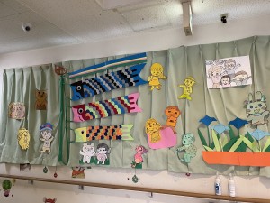 《5月》利用者様にこいのぼりを思い思いに塗っていただきました。 カラフルで可愛いこいのぼり🎏が揃いました✨